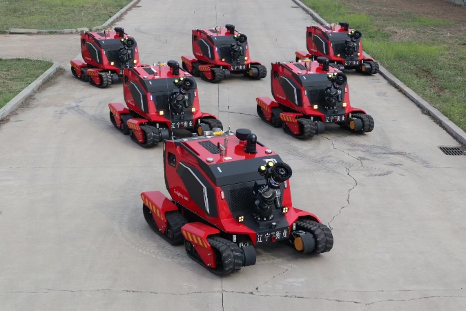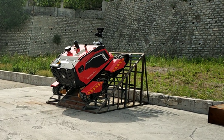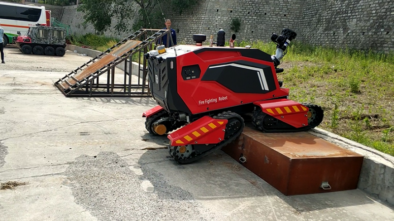 在驗(yàn)收現(xiàn)場(chǎng),根據(jù)山東消防救援總隊(duì)提出的驗(yàn)收標(biāo)準(zhǔn),與同行競(jìng)品分別進(jìn)行了垂直越障、S型行走、45度爬坡、單邊橋行進(jìn)、拖拉水帶行走、射水距離、夜間盲操等性能測(cè)試。