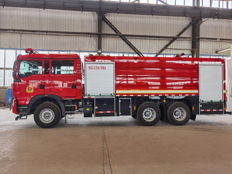 車(chē)輛底盤(pán)為豪沃ZZ5357TXFV464MF5底盤(pán),發(fā)動(dòng)機(jī)型號(hào)MC11.46-61,功率:341kw,國(guó)六排放標(biāo)準(zhǔn),軸距4300mm+1400mm,罐體材質(zhì):優(yōu)質(zhì)碳鋼板;容罐容量:水12000kg; 消防泵為雄真CB10/60-XZ;消防炮為威斯特PS50W。